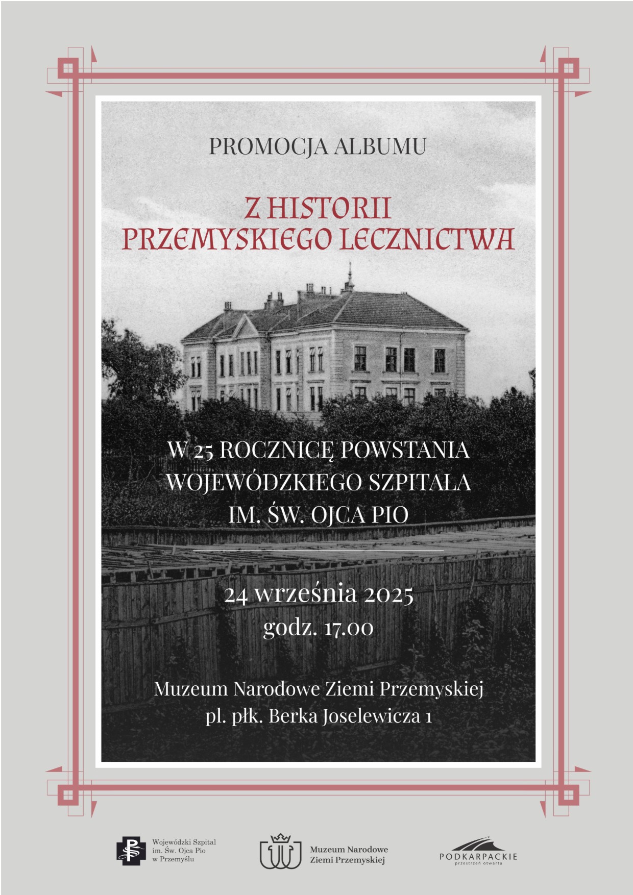 Wojewódzki Szpital im. św. Ojca Pio w Przemyślu oraz Muzeum Narodowe Ziemi Przemyskiej serdecznie zapraszają na promocję nowego wydawnictwa albumowego pod tytułem „Z historii przemyskiego lecznictwa. W 25 rocznicę powstania Wojewódzkiego Szpitala im. św. Ojca Pio”. Wydarzenie będzie miało miejsce w środę 24 września 2025 roku o godzinie 17.00 w budynku głównym Muzeum przy placu płk. Berka Joselewicza 1.